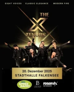 Die Tenor-Sensation kommt nach Deutschland! Acht international gefeierte Sänger aus sechs Nationen, eine große Live-Band und ein einzigartiges Konzert mit den größten Hits aus Klassik, Rock & Pop – zum Auftakt ihrer Welt-Tournee kommen THE X TENORS für ein exklusives Konzert in die Stadthalle Falkensee!
